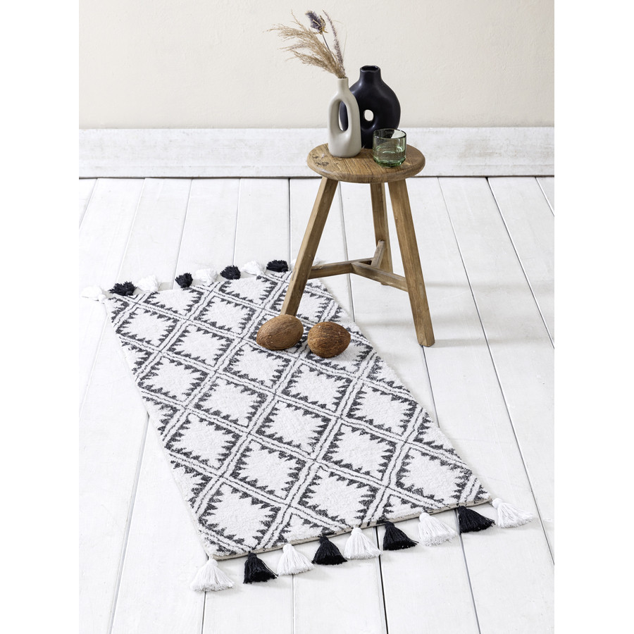 Το βαμβακερό χαλάκι Tribe έχει λευκή βάση και γεωμετρικό μοτίβο με μαύρo χρώμα, μια διαχρονική αλλά και ενδιαφέρουσα χρωματική αντίθεση. Στο τελείωμά του εναλάσσονται φούντες σε λευκό και μαύρο χρώμα, ενισχύονυας την boho διάθεσή του. Ένα χαλάκι διαδρόμου που ξεχωρίζει στον χώρο και θα τον αναδείξει με την καλαισθησία και τη διαφορετικότητά του. Χάρη στην ουδέτερη εκρού βάση του ταιριάζει εύκολα στο σπίτι και συνδυάζεται με πολλά διαφορετικά χρώματα. Ένα ξεχωριστό χαλάκι για να δημιουργήσετε μια καλόγουστη και ιδιαίτερη εικόνα σε όποιο χώρο του σπιτιού σας εμπνεύσει.