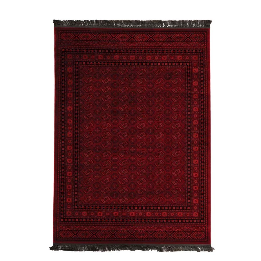Κλασσικό χαλί Afgan σε βαθιές σκούρες αποχρώσεις του κόκκινου, με γεωμετρικά μοτίβα που επαναλαμβάνονται και σκούρα κρόσσια.