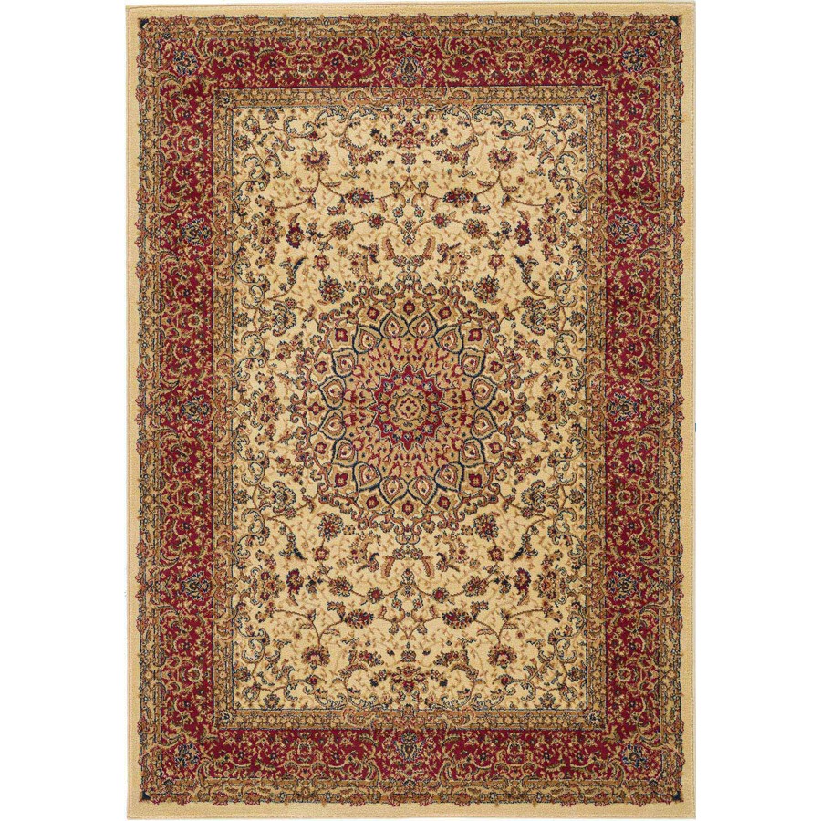 Κλασικό χαλί σαλονιού Classic της εταιρίας Atlantis σε ποικιλία διαστάσεων, με κόκκινη ζεστή απόχρωση στην μπορντούρα, με λεπτομερές σχέδιο και ροζέτα στο κέντρο, σε κρεμ φόντο.