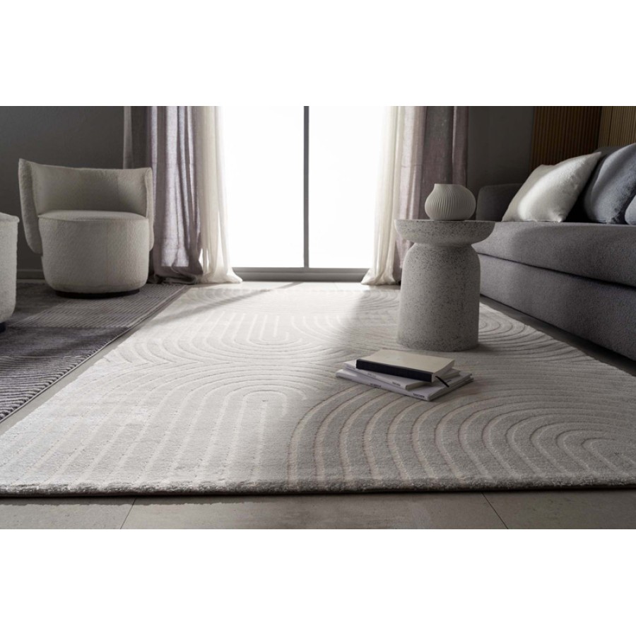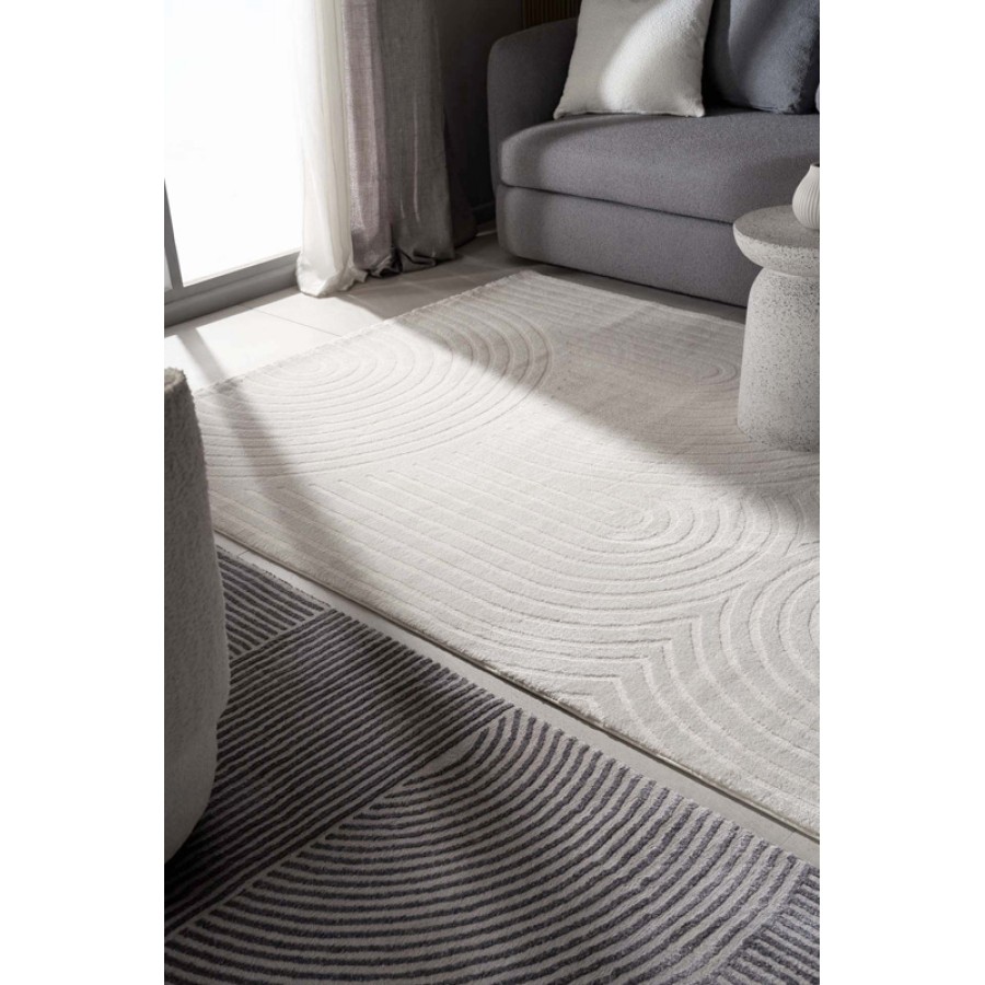 Μοντέρνο ανάγλυφο χαλί Organic. Διακρίνεται για τα γραμμικά γεωμετρικά μοτίβα και την ποικιλία απαλών χρωματικών τόνων.