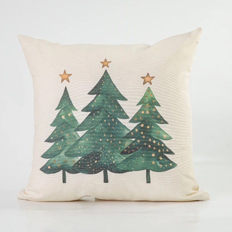 Χριστουγεννιάτικη διακοσμητική μαξιλαροθήκη, με τυπωτό σχέδιο τρία έλατα με ολόχρυσο αστέρι στην κορυφή τους.