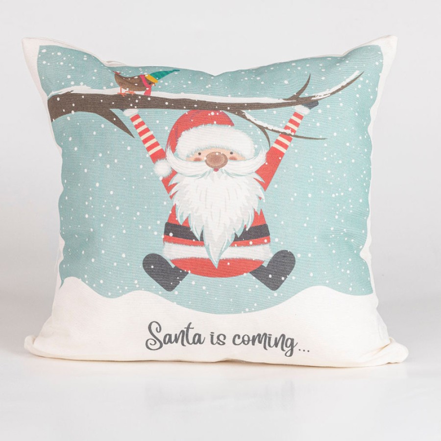 Χριστουγεννιάτικη διακοσμητική μαξιλαροθήκη, με τυπωτό σχέδιο έναν Άγιο Βασίλη πιασμένος σε χιονισμένο κλαδί.