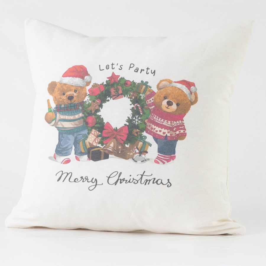 Χριστουγεννιάτικη διακοσμητική μαξιλαροθήκη, με τυπωτό σχέδιο δύο χαριτωμένα αρκουδάκια.