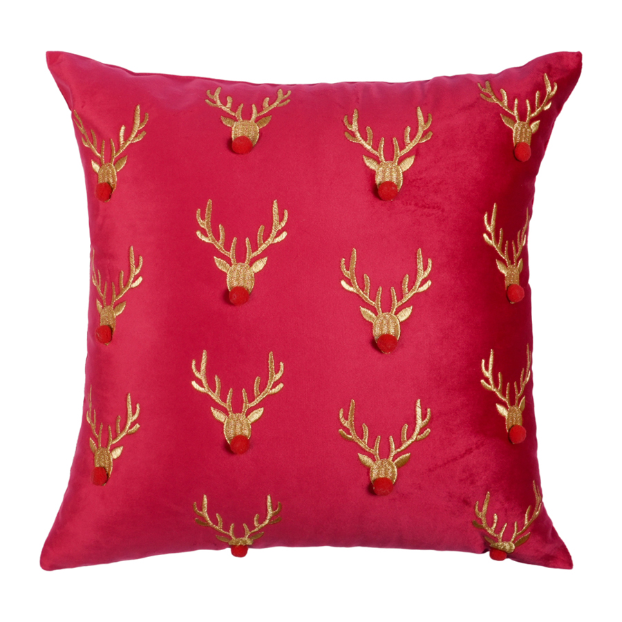 Βελουτέ χριστουγεννιάτικη διακοσμητική μαξιλαροθήκη, σε κόκκινο χρώμα και με κεντημένοι χρυσοί τάρανδοι με κόκκινη μύτη. Διαθέτει φερμουάρ για να αφαιρείται η γέμιση. Στολίστε οποιονδήποτε χώρο του σπιτιού και δώστε μία μοναδική Χριστουγεννιάτικη ατμόσφαιρα.