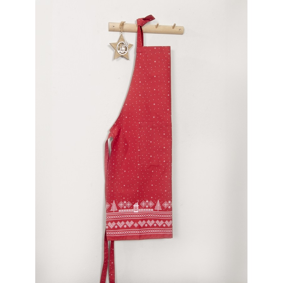 Η Χριστουγεννιάτικη ποδιά Wonderland ξεχωρίζει για τον εντυπωσιακό συνδυασμό του κλασικού κόκκινου χρώματος με το μοναδικό, λευκό, εορταστικό μοτίβο με διακριτικά αστεράκια. Η έμφαση, όμως, δίνεται στη πλούσια μπορντούρα στο τελείωμα της ποδιάς. Πρόκειται για ένα λεπτομερές, λευκό μοτίβο, εμπνευσμένο από την σκανδιναβική τέχνη, που απεικονίζει επαναλαμβανόμενα σχέδια χριστουγεννιάτικων δέντρων, μικρών σπιτιών και γεωμετρικών στοιχείων. Είναι ιδανική για να σας προστατεύσει "κομψά" τις γιορτινές μέρες του χρόνου. Συνδυάστε τη με ασορτί τραπεζομάντηλο, γάντι και πιάστρα κουζίνας για ένα ολοκληρωμένο look.