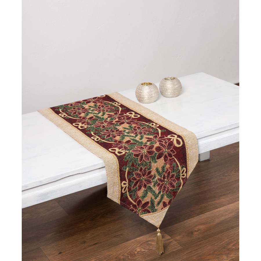 Χριστουγεννιάτικη τραβέρσα από στόφα, σε μπεζ-μπορντό φόντο, με χριστουγεννιάτικο μοτίβο αλεξανδρινό και χρυσή διακοσμητική φούντα στη μύτη που θα χαρίσει γιορτινό κλίμα στον χώρο σας.