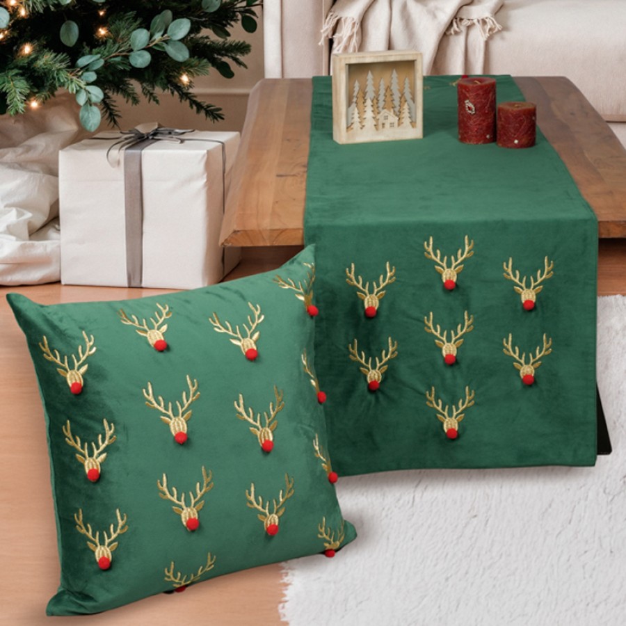 Βελουτέ χριστουγεννιάτικη τραβέρσα, σε πράσινο χρώμα και με κεντημένοι χρυσοί τάρανδοι με κόκκινη μύτη. Στολίστε οποιονδήποτε χώρο του σπιτιού και δώστε μία μοναδική Χριστουγεννιάτικη ατμόσφαιρα.