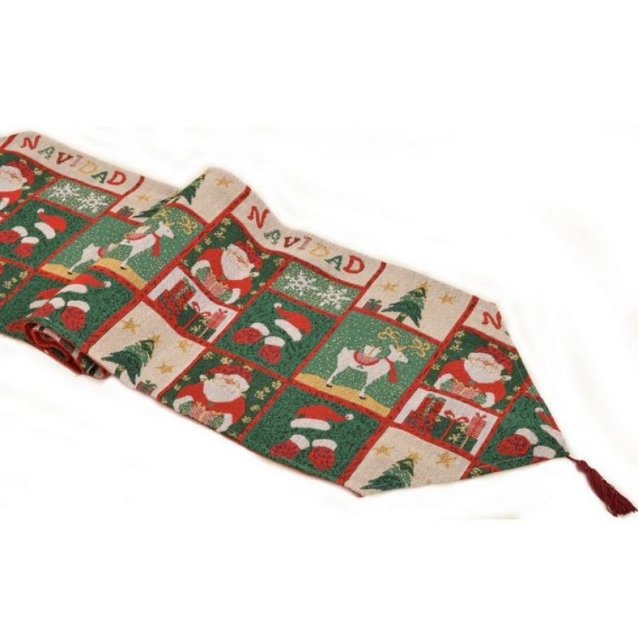 Χριστουγεννιάτικη τραβέρσα από στόφα, με κόκκινες, πράσινες και μπεζ λεπτομέρειες, με μοτίβο τον Άγιο Βασίλη και το ελάφι. Στολίζεται με μπορντό διακοσμητική φούντα στη μύτη. Ιδανικό για να στολίσετε τον χώρο σας τις γιορτές.