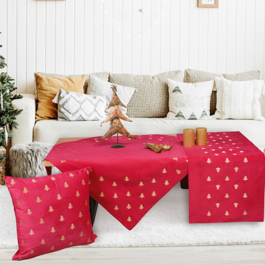Χριστουγεννιάτικο καρέ βελουτέ, σε κόκκινο χρώμα και με κεντημένα χρυσά ελατάκια. Στολίστε οποιονδήποτε χώρο του σπιτιού και δώστε μία μοναδική Χριστουγεννιάτικη ατμόσφαιρα.