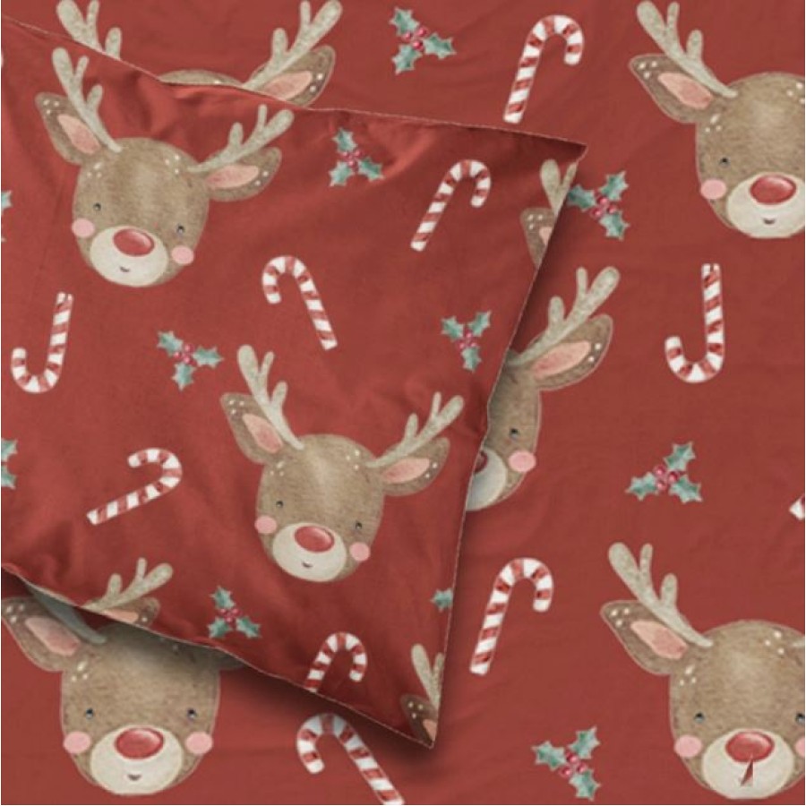 Χριστουγεννιάτικο σεντόνι μεμονωμένο διπλό-υπέρδιπλο, σε κόκκινο χρώμα, με σχέδιο τον Rudolf το ελαφάκι. Δώστε μία χριστουγεννιάτικη διάθεση στο υπνοδωμάτιο σας, σε αποχρώσεις και σχέδια που προσδίδουν μια εορταστική νότα.