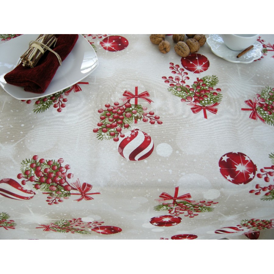 Χριστουγεννιάτικο τραπεζομάντηλο με χριστουγεννιάτικες μπάλες και γκι.
