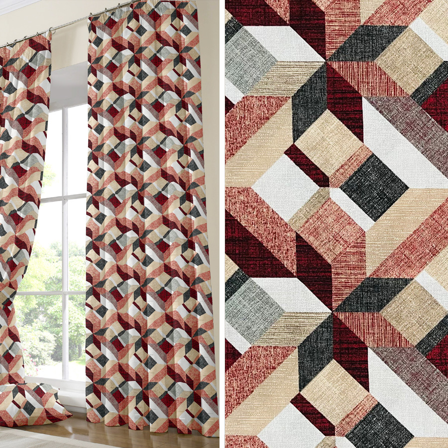 Έτοιμη κουρτίνα με γεωμετρικό σχέδιο σε μπορντό και γκρι αποχρώσεις , με vintage διάθεση.