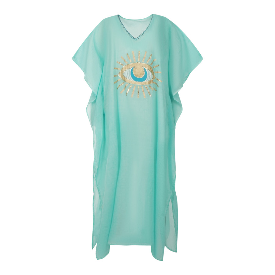 Ένα εντυπωσιακό καφτάνι με πλούσιο κέντημα σε aqua απόχρωση, που χαρίζει θηλυκότητα σε κάθε εμφάνιση.