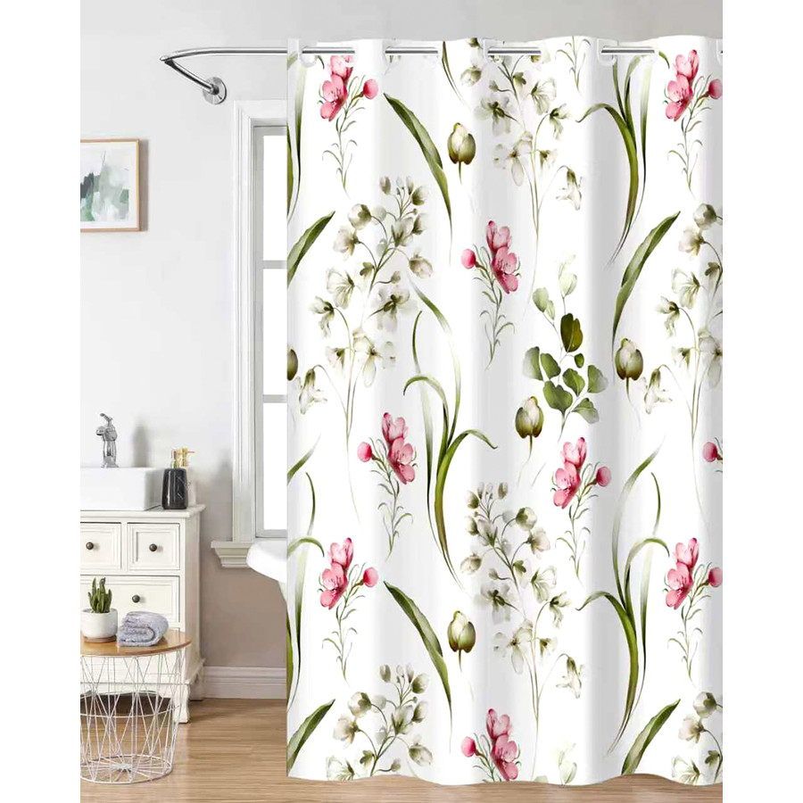 Κουρτίνα μπάνιου με φόντο λευκό χρώμα και με φλοράλ σχέδιο σε πράσινο και ροζ χρώμα, κατασκευασμένη από 100% υψηλής ποιότητας polyester, ένα υλικό που συνδυάζει την ανθεκτικότητα με την ευκολία στη φροντίδα. Χάρη στην υδρόφοβη φύση της δεν προσελκύει τη μούχλα, ενώ πλένεται και στεγνώνει πάρα πολύ εύκολα και γρήγορα, καθιστώντας την ιδανική για την καθημερινότητά σας. Η κουρτίνα διαθέτει ενσωματωμένα τρουκς που διευκολύνουν την τοποθέτηση και την αφαίρεσή της από το στήριγμα. Τα τρουκς είναι κατασκευασμένα από ανθεκτικό υλικό, προσφέροντας μακροχρόνια χρήση χωρίς φθορές. Είναι ανθεκτική στο χρόνο και στις συχνές χρήσεις, διατηρώντας το χρώμα και τη φρεσκάδα της για πολύ καιρό.