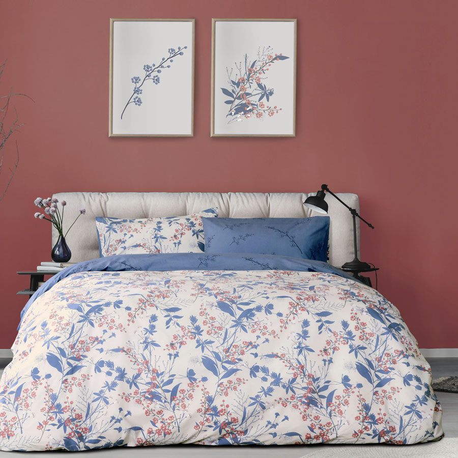 Τα διάσπαρτα λουλούδια σε αποχρώσεις του ροζ και του γαλάζιου, φέρνουν την αίσθηση της άνοιξης στο υπνοδωμάτιο.