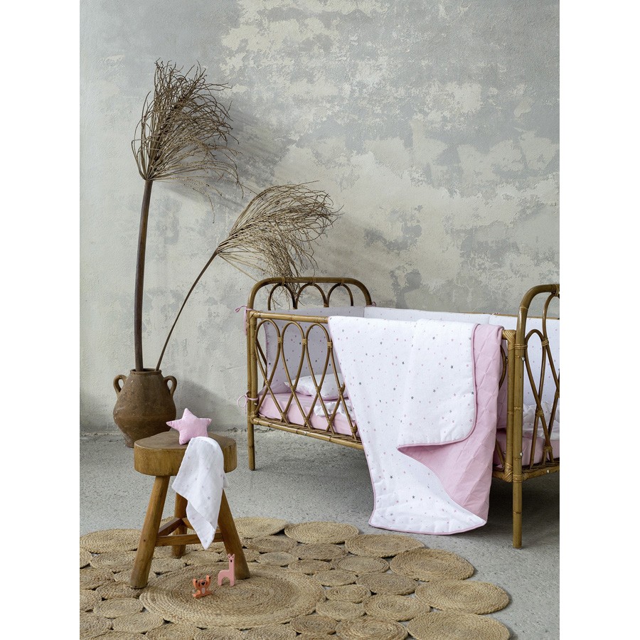 Το κουβερλί κούνιας Nene Pink στη μία όψη είναι διακοσμημένο με τα πιο γλυκά αστεράκια σε τυπωτό σχέδιο και στην άλλη του όψη είναι μονόχρωμο ροζ ώστε να επιλέγετε αυτό που σας αρέσει κάθε φορά. Το απαλό ροζ χρώμα του εκφράζει την αθωότητα και την ευαισθησία για μια κλασική κοριτσίστικη και ρομαντική αισθητική στο παιδικό δωμάτιο. Το σχέδιό του συνδυάζει αρμονικά την απλότητα με τη διακόσμηση ώστε να προσφέρει μια ανάλαφρη, καθαρή αίσθηση. Δημιουργήστε ένα βρεφικό δωμάτιο γεμάτο γλυκύτητα και θαλπωρή, για να κάνει το αστεράκι σας τα πρώτα του όνειρα.