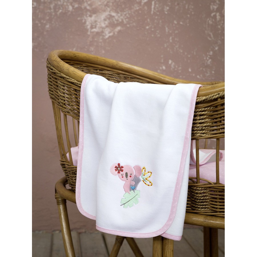 Η κουβέρτα Sweetland έχει κεντητό μοτίβο με χαριτωμένο ροζ κοάλα πάνω σε λευκή βάση και έχει περιμετρικό τελείωμα με ροζ τυπωτό ρελάκι, φέρνοντας μια γλυκιά και όμορφη διάθεση στο βρεφικό δωμάτιο.Η παιχνιδιάρικη όψη της χαρίζει στο μωράκι σας όμορφες στιγμές χαράς, καθώς θα ανακαλύπτει τα γλυκά ζωάκια και θα μοιράζεται μαζί σας τον ενθουσιασμό του.