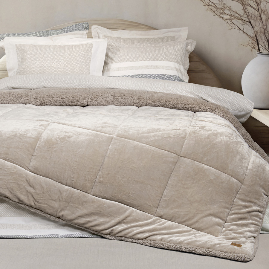 Το Κουβερτοπάπλωμα Cira Beige συνδυάζει τη ζεστασιά και την πολυτέλεια με μια μοντέρνα αίσθηση. Η πάνω πλευρά του είναι κατασκευασμένη από μονόχρωμο flannel, προσφέροντας απαλή και πολυτελή αίσθηση, ενώ η κάτω πλευρά είναι καλυμμένη με sherpa, παρέχοντας εξαιρετική θερμότητα και άνεση. Το σκούρο πράσινο χρώμα του προσθέτει χαρακτήρα στο υπνοδωμάτιό σας και συνδυάζεται όμορφα με γήινα χρώματα, δίνοντας ένα άψογο αισθητικό αποτέλεσμα. Το κουβερτοπάπλωμα αυτό είναι ιδανικό για τις πιο κρύες νύχτες, καθώς η πλούσια βελουτέ υφή του και η αφράτη και ζεστή αίσθηση της sherpa, εξασφαλίζoυν ένα πραγματικό χουχούλιασμα στο κρεβάτι σας.