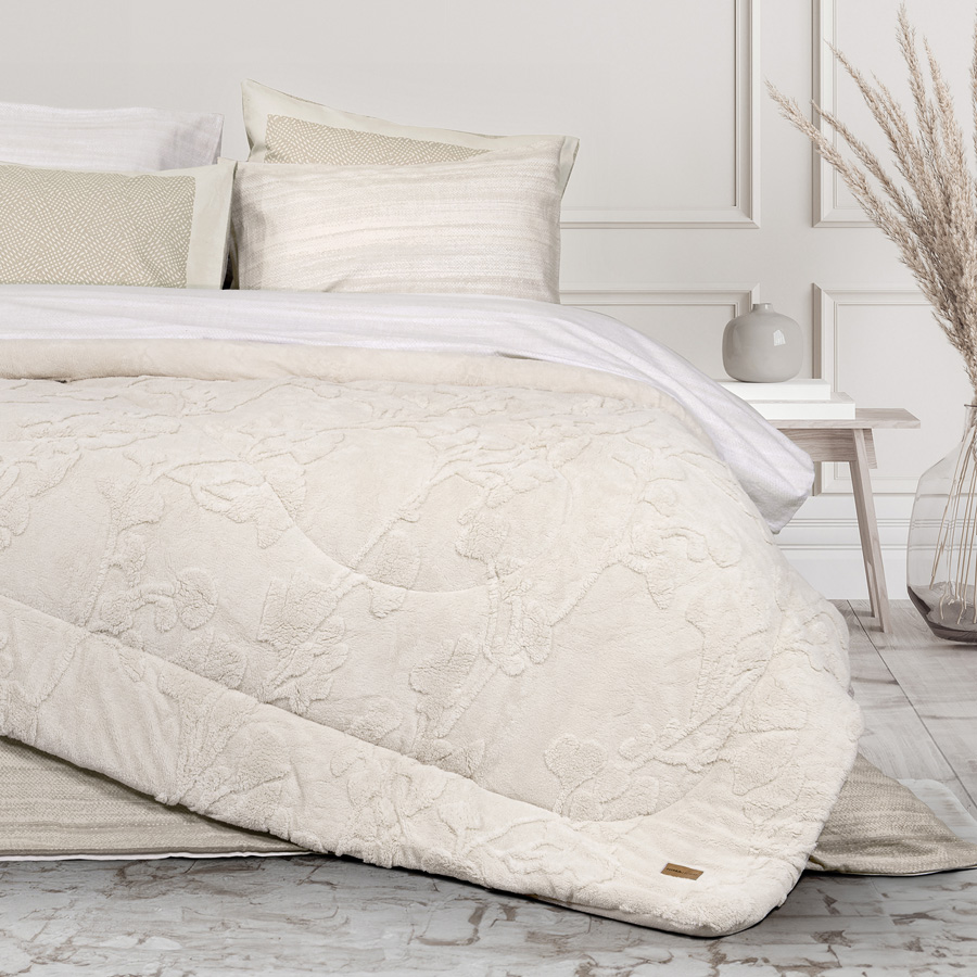 Κουβερτοπάπλωμα με σύνθεση από 100% πολυέστερ. Ένα ζεστό και απαλό πάπλωμα από Sherpa jacquard συνδυασμένη με την απαλή υφή του coral fleece. Ιδανικό για τις κρύες φθινοπωρινές και χειμωνιάτικες νύχτες. Το χαρακτηριστικό του πολυεστερικού υφάσματός του είναι η αντοχή, μιας και μπορεί να διατηρήσει αναλλοίωτο το σχήμα και το χρώμα του για πάρα πολλά χρόνια και μετά από πολλές πλύσεις. Δεν ζαρώνει, ούτε και χρειάζεται ιδιαίτερη φροντίδα. Επιπλέον, ανήκει στα λευκά είδη που δεν προσελκύουν το σκόρο όταν αποθηκεύονται για τους καλοκαιρινούς μήνες. Ιδανικό για να σας προσφέρει ζεστασιά και άνεση στον ύπνο.