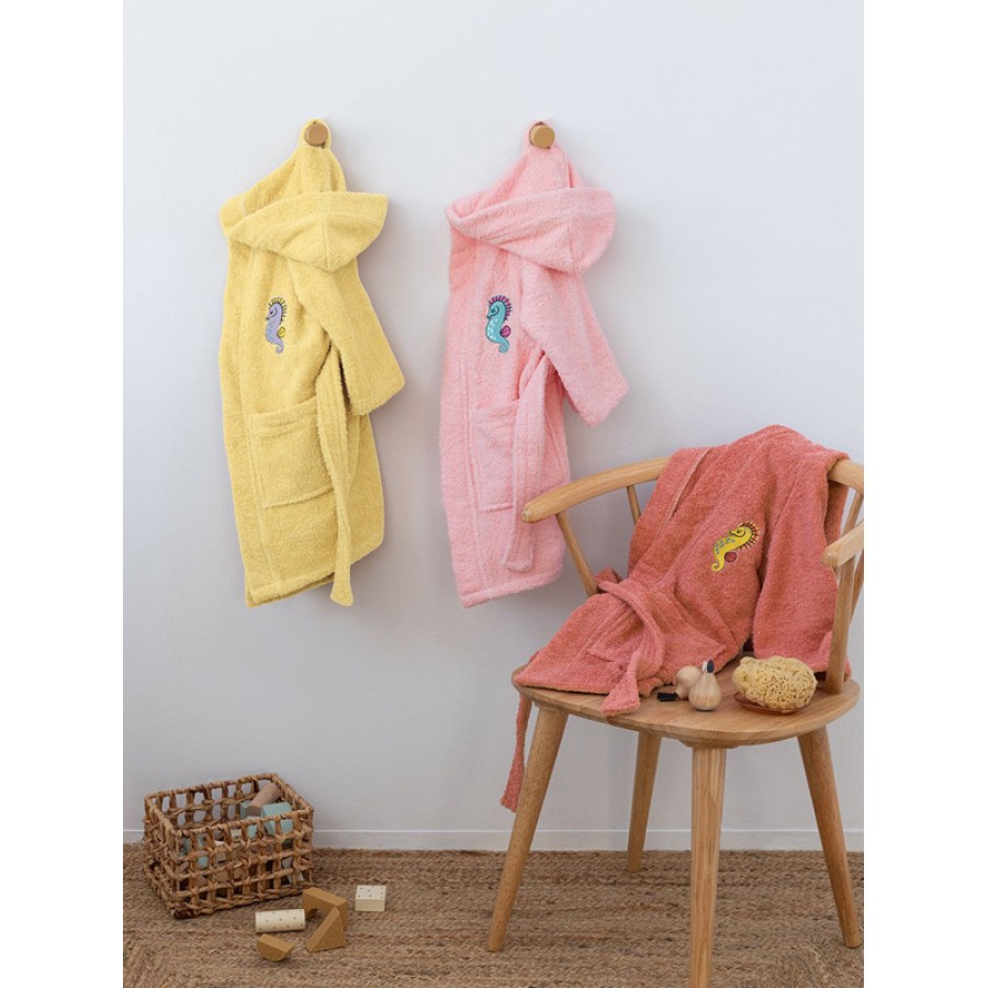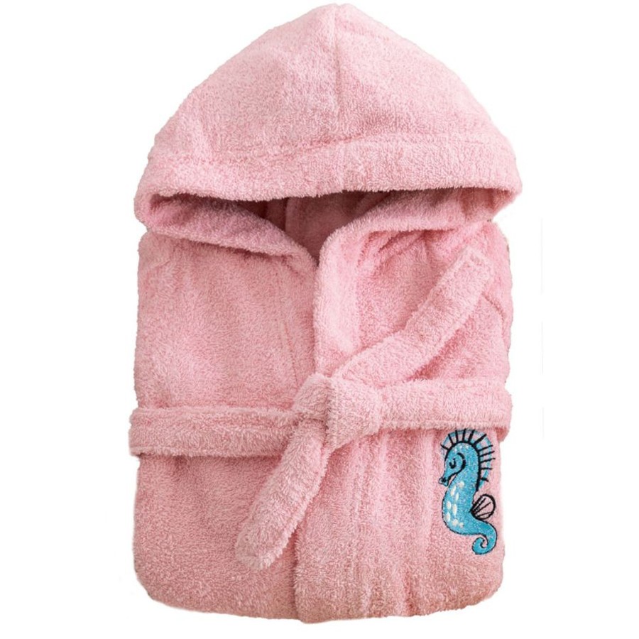 Μπουρνούζι παιδικό, μονόχρωμο, με κουκούλα και ζώνη, με κεντημένο σχέδιο ιππόκαμπος.