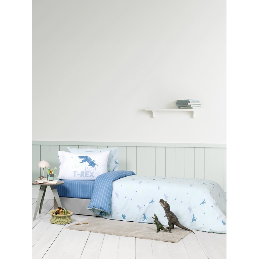 Το παιδικό πάπλωμα Roar είναι η απόλυτη επιλογή για τους μικρούς λάτρεις των δεινοσαύρων και της περιπέτειας! Είναι διακοσμημένο με σιλουέτες δεινοσαύρων T-Rex, πάνω σε απαλό γαλάζιο φόντο, δημιουργώντας μια ζωντανή και διασκεδαστική ατμόσφαιρα. Η κάτω πλευρά έχει λεπτές γαλάζιες ρίγες πάνω σε έντονο μπλε χρώμα, που προσθέτει δυναμισμό και στυλ. Αυτό το πάπλωμα θα ξυπνήσει τη φαντασία των παιδιών και θα μετατρέψει το παιδικό κρεβάτι σε ένα πεδίο εξερεύνησης. Συνδυάστε το με το ασορτί σετ σεντονιών και αφήστε το παιδί σας να χαρεί αυτό που του δίνει κέφι και χαρά!