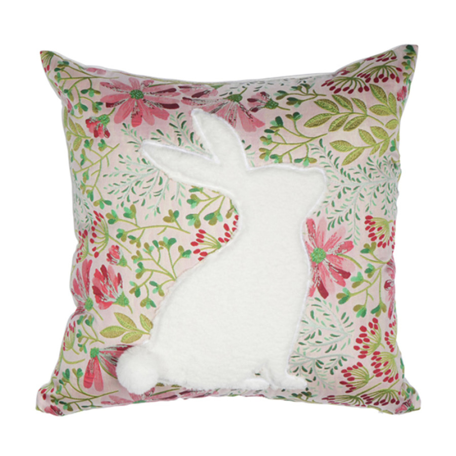 Μαξιλαροθήκη φιγούρας με τυπωτά ανοιξιάτικα λουλούδια και απλικέ χνουδωτό λευκό κουνελάκι.