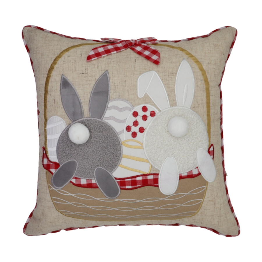 Πασχαλινή Διακοσμητική Μαξιλαροθήκη (45x45) Λινή Απλικέ Newhome 0809 Καλάθι με Καρώ Φιόγκο