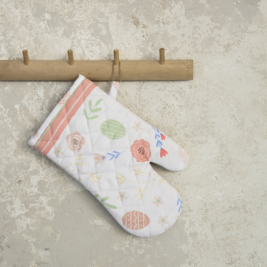 Γάντι κουζίνας πασχαλινό με σύνθεση από 100% cotton. Είναι πολύ απαλό, ανθεκτικό και έχει εξαιρετική εφαρμογή στο χέρι. Όπως όλα τα βαμβακερά λευκά είδη είναι αντιστατικό, υποαλλεργικό και έχει μεγάλη αντοχή στο χρόνο και τις συχνές πλύσεις. Χάρη στην ποιότητα κατασκευής του, διατηρεί το σχήμα και το χρώμα του με την πάροδο του χρόνου. Ιδανικό για να συνοδεύσει τα πασχαλινά σας μαγειρέματα.