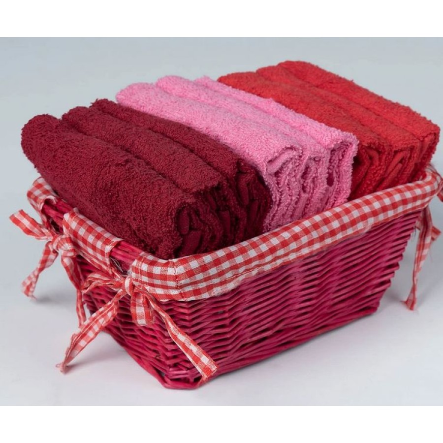 Καλαθάκι, ντυμένο με καρώ ύφασμα εσωτερικά, με 9 μικρές πετσέτες-λαβέτες , σε αποχρώσεις κόκκινο-ροζ.