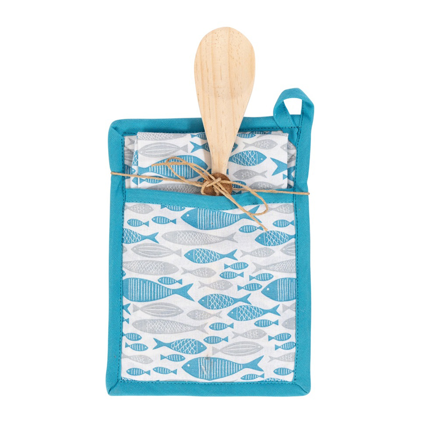 Σετ Κουζίνας 3τεμ (Πιάστρα | Ποτηρόπανο | Ξύλινη Κουτάλα) Newhome 90040 Ψαράκια