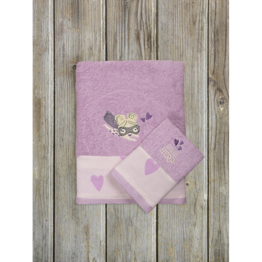 Σετ παιδικές πετσέτες με κεντημένη μικρή ηρωίδα και φάσα υφασμάτινη στην μπορντούρα, απαλό και απορροφητικό, για το μπάνιο της μικρής σας ηρωίδας.