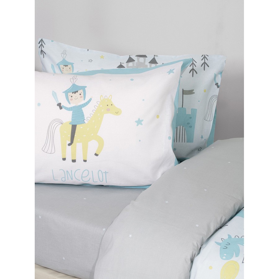 Τo βαμβακερό σετ παπλωματοθήκης Lancelot θα μεταμορφώσει το παιδικό δωμάτιο σε ένα μαγικό βασίλειο, γεμάτο με ιππότες, δράκους και κάστρα, όλα σχεδιασμένα με λιτές ανεπιτήδευτες γραμμές, σαν μια παιδική ζωγραφιά. Η δεύτερη όψη της παπλωματοθήκης έχει μονόχρωμο ανοιχτό γκρι φόντο με λευκούς αστερισμούς, προσφέροντας μια ηρεμία στο σετ, αλλα και μια δεύτερη επιλογή στρωσίματος. Η μαξιλαροθήκη του σετ τονίζει την "μαγικότητα" καθώς έχει πάνελ μοτίβο στην μία της όψη και παρουσιάζει ένα κεντρικό σχέδιο με τον ιππότη και την επιγραφή "LANCELOT" πλαισιωμένο με γαλάζια φάσα, ενώ η δεύτερη όψη της έχει το επαναλαμβανόμενο μοτίβο με τους ιππότες. Η χρωματική παλέτα του σετ είναι φωτεινή και ευχάριστη. Το βασικό φόντο είναι ένα απαλό γαλάζιο, ενώ οι φιγούρες έχουν κίτρινο, τιρκουάζ, γκρι και πράσινο χρώμα, δημιουργώντας μια χαρούμενη και ισορροπημένη αισθητική. Ο σχεδιασμός του σετ είναι ζωντανός και γεμάτος φαντασία, κάνοντας την ώρα του ύπνου μια συναρπαστική ιστορία.