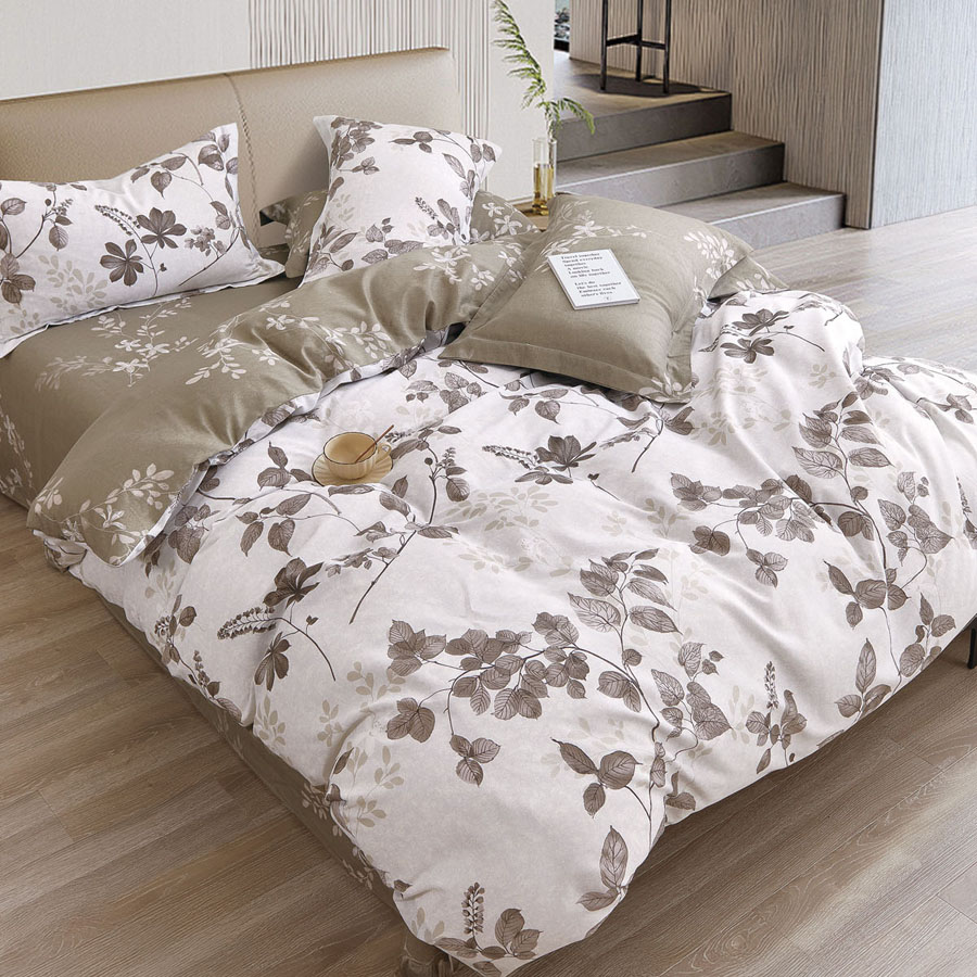 Υπέρκομψο σετ παπλωματοθήκης διπλής όψης σε ανοιχτή βάση με μπεζ λουλούδια.