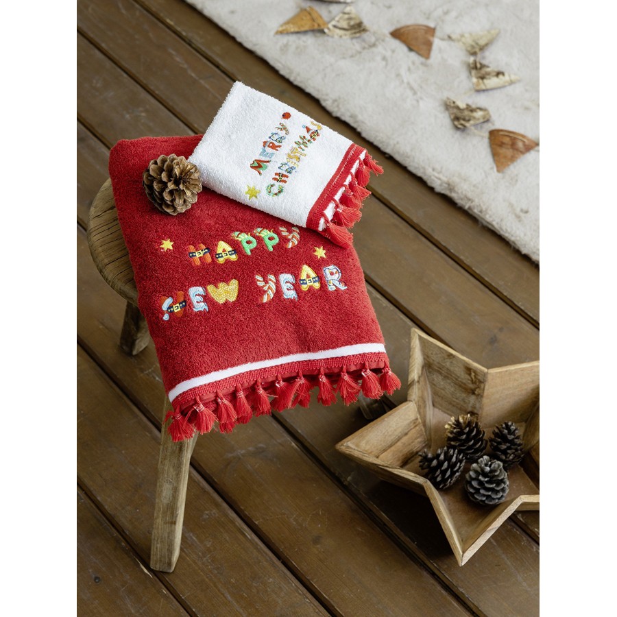 Το βαμβακερό σετ πετσέτες Wishes είναι γεμάτο χαρά και χριστουγεννιάτικη μαγεία, ιδανικό για να συνοδεύσει τις γιορτές των μικρών σας. Η μεγάλη πετσέτα σε έντονο κόκκινο χρώμα φέρει κεντημένη την ευχή "Happy New Year" με ζωηρά γράμματα που θυμίζουν παιχνίδια, γλυκά και γιορτινές διακοσμήσεις. Τα χαρούμενα σχέδια και τα παιχνιδιάρικα κρόσσια στις άκρες της πετσέτας προσθέτουν μια αίσθηση διασκέδασης που θα λατρέψουν τα παιδιά. Η μικρότερη λευκή πετσέτα με το μήνυμα "Merry Christmas", διακοσμημένη με αστέρια και πολύχρωμα γράμματα, συμπληρώνει το σετ, ενώ τα κόκκινα κρόσσια την κάνουν ακόμα πιο ελκυστική. Ένα γιορτινό και διασκεδαστικό σετ που θα κάνει κάθε μπάνιο πιο ευχάριστο και θα φέρει το πνεύμα των Χριστουγέννων στο δωμάτιο του παιδιού σας.