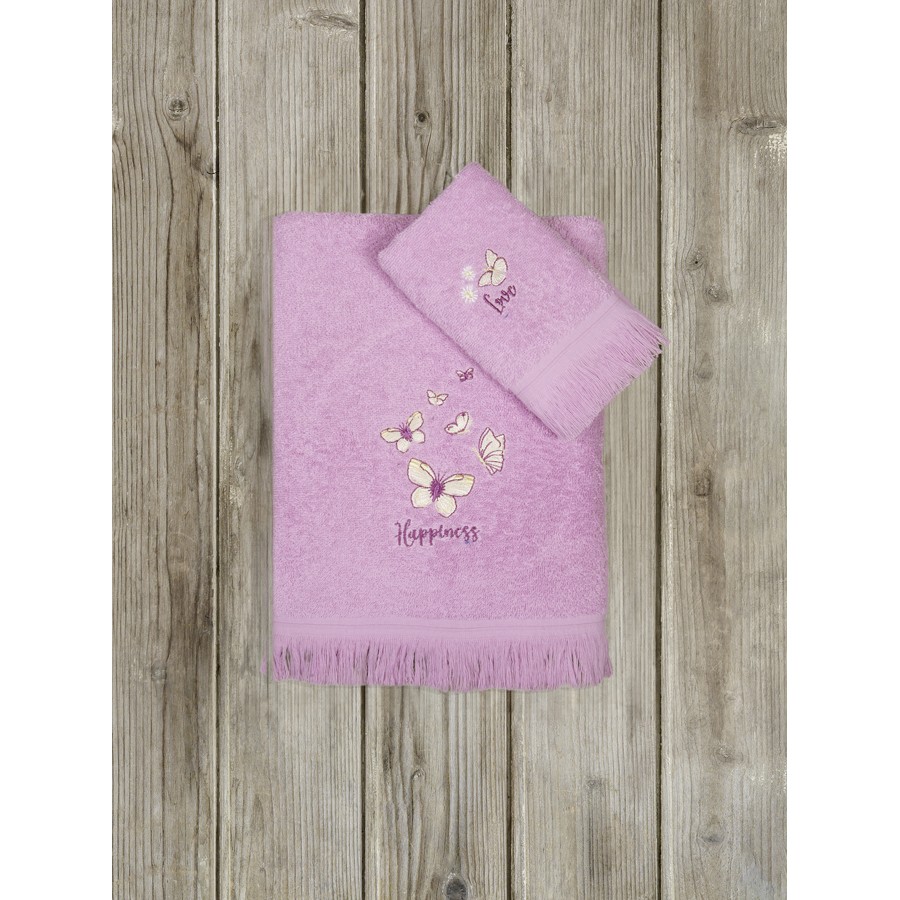 Το βαμβακερό σετ πετσέτες Bettina έχουν ιδιαίτερο κεντητό σχέδιο με χαριτωμένες πεταλούδες σε κρεμ και ροζ αποχρώσεις. Είναι κεντημένες με προσοχή στη λεπτομέρεια και δινουν μια παιχνιδιάρικη και ονειρεμένη πινελιά. Οι διακριτικές λέξεις "Love" και "Happiness" συμπληρώνουν μοναδικά το ύφος, μεταφέροντας ένα μήνυμα ζεστασιάς και χαμόγελου. Το υπέροχο ροζ-λιλά χρώμα τους και το όμορφο παιχνιδιάρικο τελείωμα με κρόσσια, αποπνέουν γλυκύτητα και τρυφερότητα. Ένα σετ που συνδυάζει πρακτικότητα, υψηλή ποιότητα και μαγευτικό σχέδιο, ιδανικό για την καθημερινότητα αλλά και ως δώρο που θα εντυπωσιάσει!