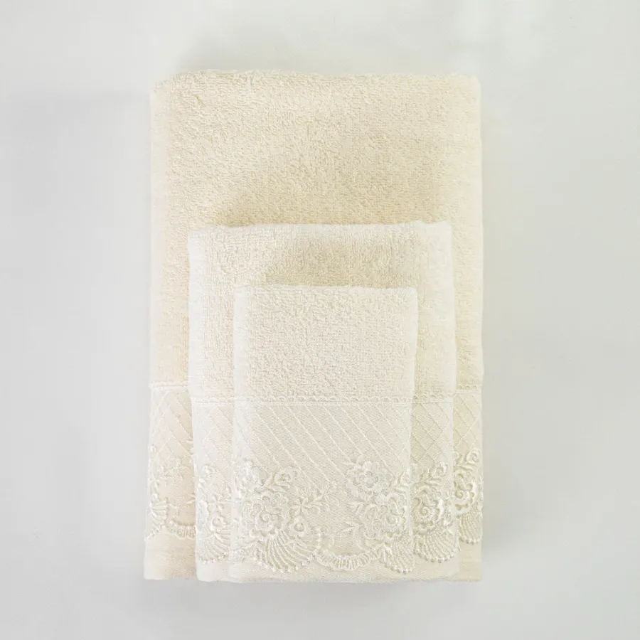 Σετ πετσέτες 3 τεμαχίων, με διακοσμητική δαντέλα στην μπορντούρα. Συσκευασία σε κουτί. Ιδανικό για δώρο γάμου.
