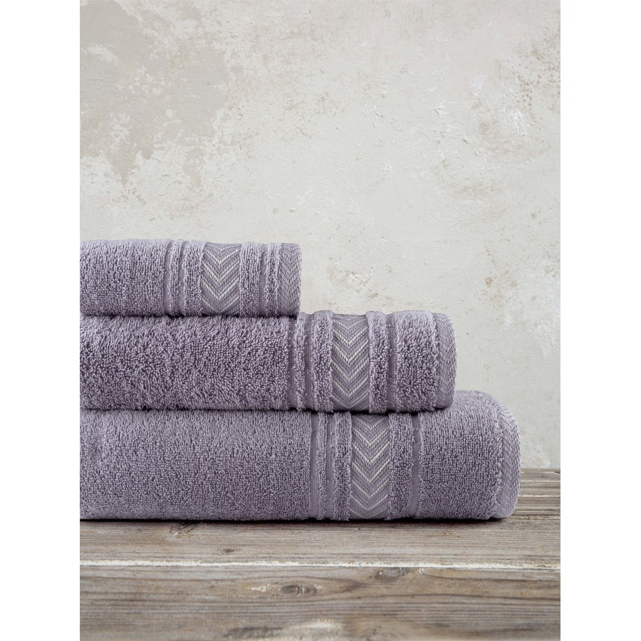 Το βαμβακερό σετ πετσέτες Kocoon Ariya έχει κομψή μωβ απόχρωση και διακοσμείται με ζακάρ σχέδιο στην μπορντούρα. Οι ανάγλυφες γεωμετρικές λεπτομέρειες συνδυάζουν τη μοντέρνα αισθητική και την κλασική φινέτσα.