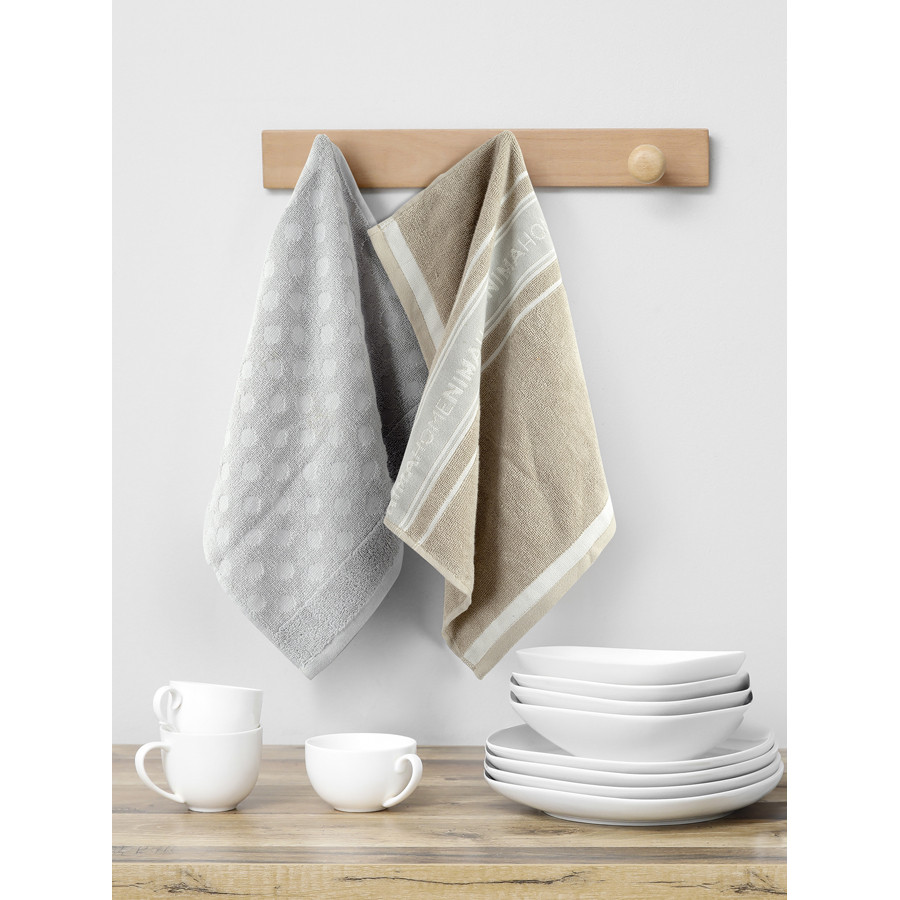 Το σετ πετσέτες κουζίνας NIMA HOME συνδυάζει ποιότητα και διακριτική αισθητική. Περιλαμβάνει δύο βαμβακερές πετσέτες, με ζακαρ σχέδιο σε διαφορετικό ύφος και διαφορετικούς χρωματισμούς. Η μία είναι μπεζ και ξεχωρίζει με τη γκρι φάσα κατά μήκος, που είναι διακοσμημένη με το λογότυπο Nima Home, προσθέτοντας μια σύγχρονη υπογραφή design. Η άλλη πετσέτα του σετ διαθέτει minimal γεωμετρικό ζακάρ μοτίβο, ιδανικό για όσους αγαπούν την καθαρή και μοντέρνα γραμμή στη διακόσμηση. Απορροφητικές, ανθεκτικές και απαλές στην αφή, αποτελούν μια πρακτική αλλά και εκλεπτυσμένη επιλογή για την καθημερινή φροντίδα της κουζίνας.