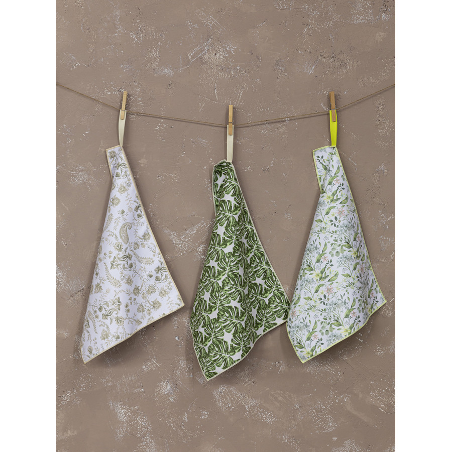 Οι πετσέτες κουζίνας Idira είναι διπλής όψης. Μονόχρωμες από την μία πλευρά, ενώ από την άλλη έχουν υπέροχα floral σχέδια με την τεχνική της νερομπογιάς που κάνουν κάθε πετσέτα να μοιάζει με ένα ξεχωριστό έργο τέχνης. Είναι σε αποχρώσεις του πράσινου και του μπεζ σε πολύχρωμο μοτίβο. Διαθέτουν μια πρακτική θηλιά που κρατά την κάθε πετσέτα σταθερή όταν διπλώνει και μπορεί να χρησιμοποιηθεί και για να την κρεμάσετε όπου σας εξυπηρετεί. Ένα διαφορετικό και ποιοτικό σετ πετσέτες κουζίνας που φέρνει τα χρώματα της φύσης μέσα στον χώρο.