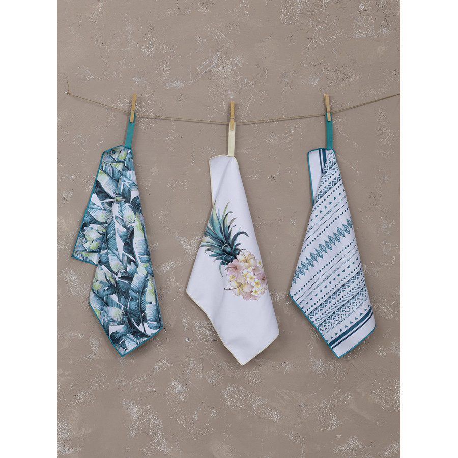 Οι πετσέτες κουζίνας Azure είναι διπλής όψης. μονόχρωμες από την μία πλευρά, ενώ από την άλλη έχουν υπέροχα tropical σχέδια με την τεχνική της νερομπογιάς που κάνουν κάθε πετσέτα να μοιάζει με ένα ξεχωριστό έργο τέχνης. Συνδυάζουν τη λευκή βάση με όλες τις αποχρώσεις του μπλε με μικρή συμμετοχή του πράσινου και του ροζ στην χρωματική παλέτα του σετ. Είναι οι διαφορέτικές και ποιοτικές πετσέτες κουζίνας που θα φέρουν την tropical-chic αισθητική στον χώρο.