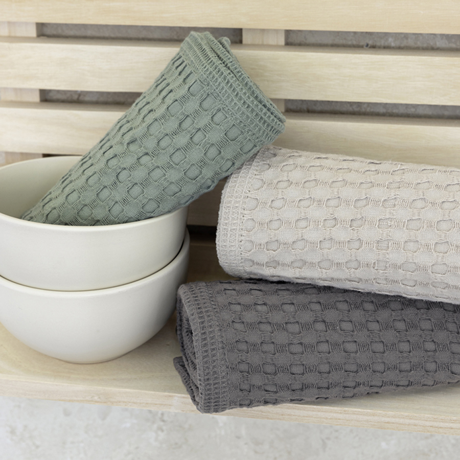 Σετ Πετσέτες κουζίνας, από 100% βαμβακερά νήματα και ύφανση βάφλας. Είναι πολύ απαλές, ιδανικές για το σκούπισμα των ποτηριών και των πιάτων, καθώς δεν αφήνουν χνούδι. Το βαμβακερό πικέ ύφασμά τους είναι πολύ απορροφητικό και στεγνώνει γρήγορα. Είναι κατάλληλες για καθημερινή χρήση στην κουζίνα σαν ποτηρόπανα ή σαν πετσέτες. Χάρη στη σύνθεσή τους από φυσικό βαμβάκι έχουν μεγάλη αντοχή στο χρόνο και διατηρούν το χρώμα και το σχήμα τους ακόμα και μετά από πολλές πλύσεις, χωρίς να απαιτούν ιδιαίτερη φροντίδα.