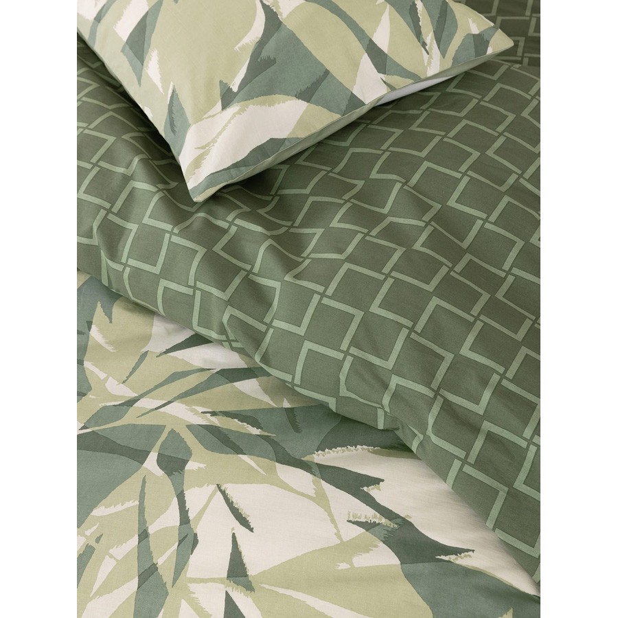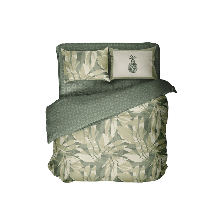 Τα βαμβακερά σεντόνια Cocomo αποπνέoυν φρεσκάδα, ζωντάνια και εξωτική ατμόσφαιρα. Το πλούσιο μοτίβο με τα τροπικά φύλλα, σε ποικίλες αποχρώσεις του πράσινου, από το λαδί έως το σμαραγδί, δημιουργούν μια αίσθηση βάθους και ενδιαφέροντος στο σχέδιο. Το κατωσέντονο έχει απλό γεωμετρικό μοτίβο σε πράσινη απόχρωση που αναδεικνύει ακόμα περισσότερο το μοτίβο του πανωσέντονου. Οι μαξιλαροθήκες του σετ είναι πάνελ με πράσινη περιμετρική μπορντούρα και κεντρικό μοτίβο με ανανά, που τονίζει τον εξωτικό χαρακτήρα του σχεδίου. Στρώστε το κρεβάτι σας με το σετ σεντονιών Cocomo, συνδυάζοντάς το με το ασορτί κουβερλί για να δώσετε ένα εξωτικό χαρακτήρα στην κρεβατοκάμαρά σας.