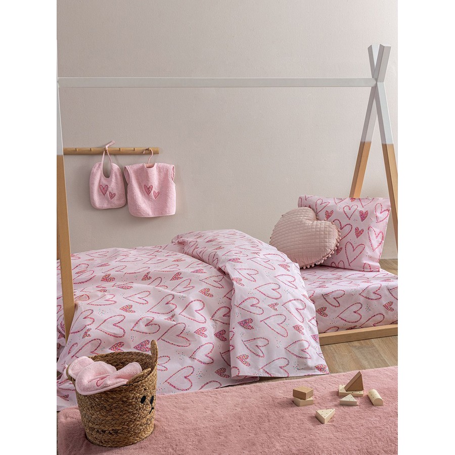 Σετ σεντόνια μονά, παιδικά, σε ροζ χρώμα και σχέδιο καρδιές, για χαρούμενη διακόσμηση στο παιδικό δωμάτιο.