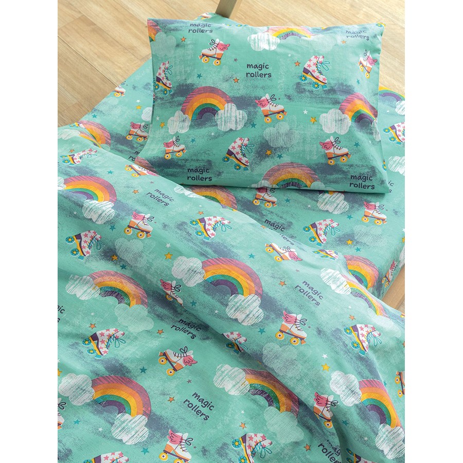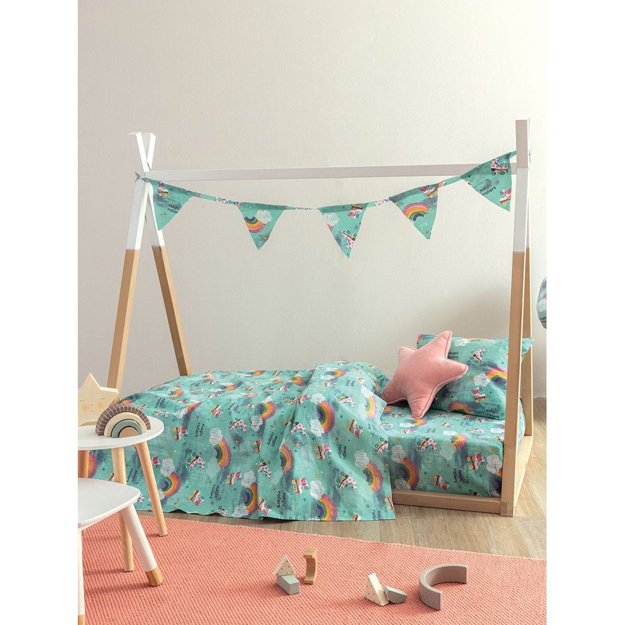 Σετ σεντόνια μονά, παιδικά, σε τυρκουάζ χρώμα, με πολύχρωμες λεπτομέρειες και σχέδιο ουράνιο τόξο, για χαρούμενη διακόσμηση στο παιδικό δωμάτιο.