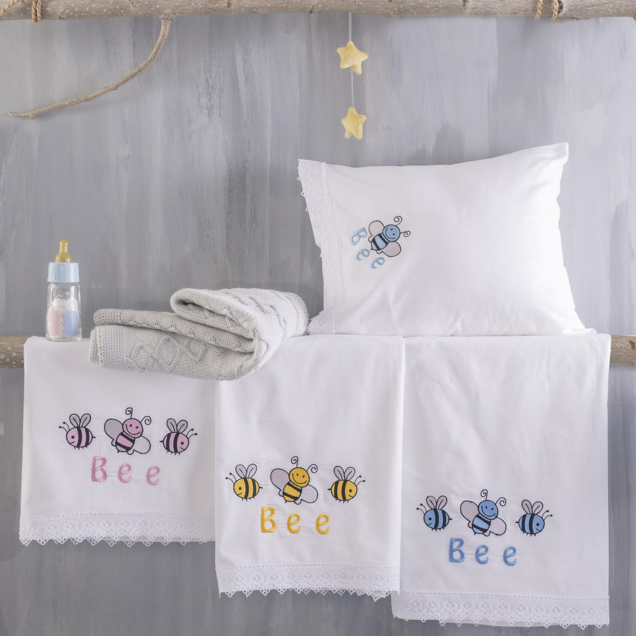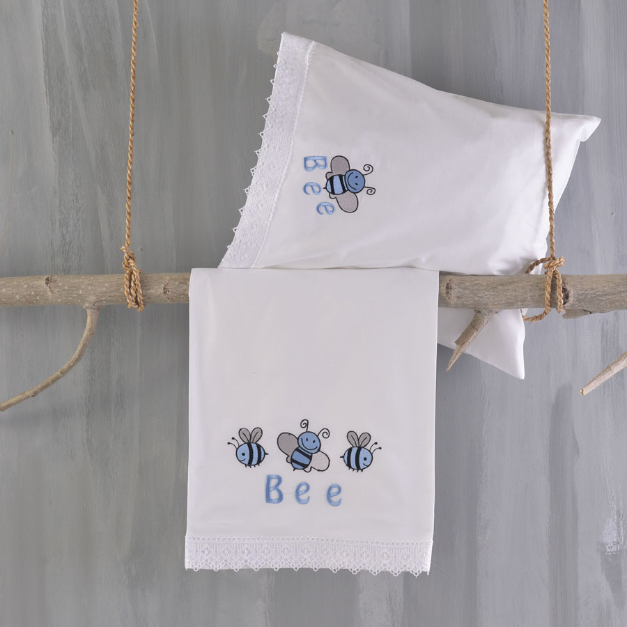 Σετ Σεντόνια Μπεμπέ Κούνιας (105x160) Με Κέντημα και Δαντέλα Βαμβακερά Rythmos Honey Bee Σιέλ