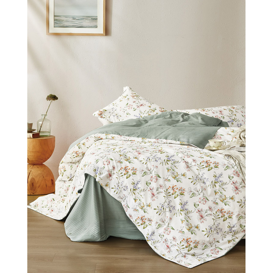 Πολυτελές σετ υπέρδιπλων σεντονιών σε ανοιχτή βάση με floral μοτίβο.
