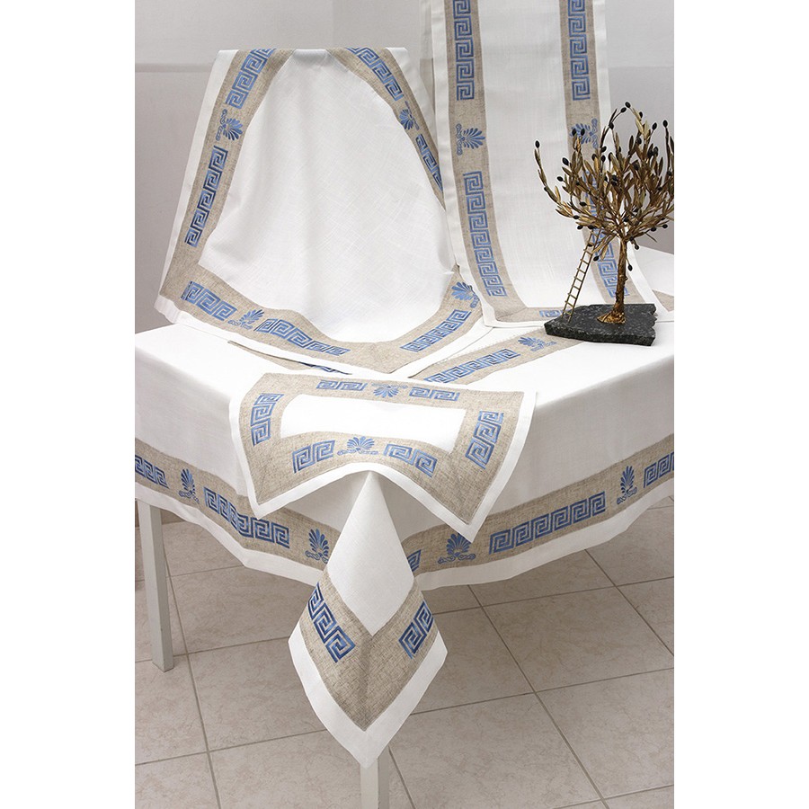 Τραπεζομάντηλο με εμφάνιση λινού και μπεζ φάσα με κλασσικό, παραδοσιακό κέντημα με μαιάνδρους, σε γαλάζιο χρώμα.