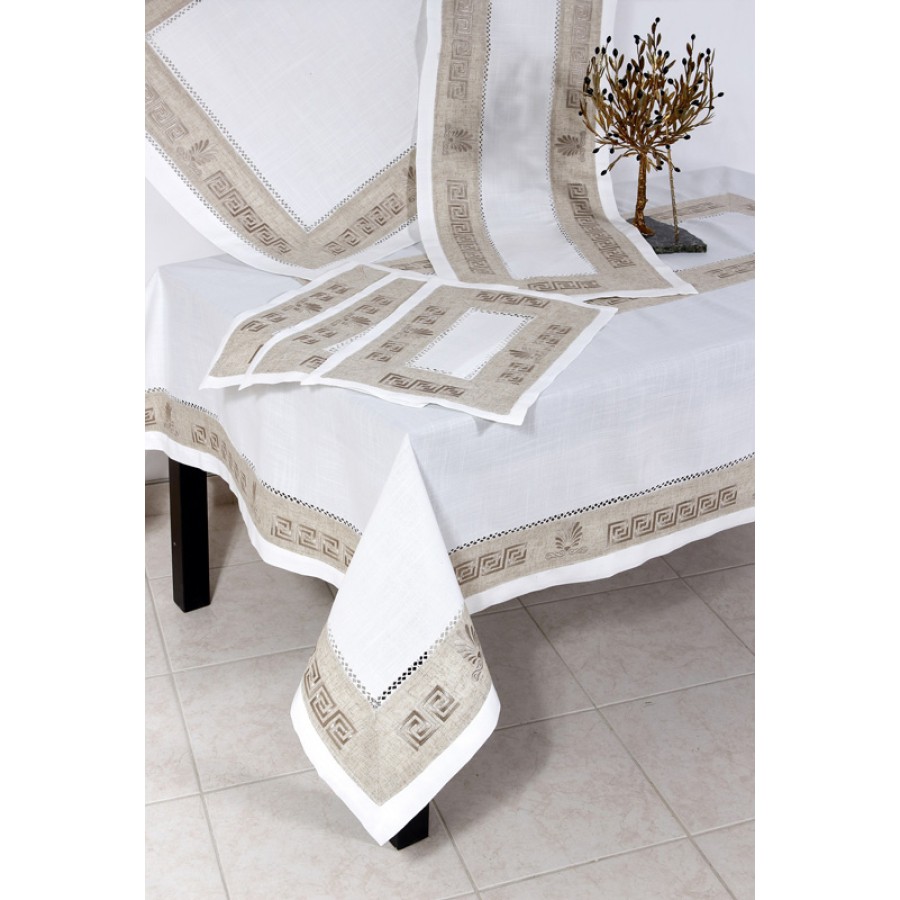 Τραβέρσα με εμφάνιση λινού και μπεζ φάσα με κλασσικό, παραδοσιακό κέντημα με μαιάνδρους.
