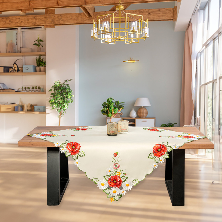 Τραβέρσα σε εκρού χρώμα, κεντητή περιμετρικά με υπέροχα ανοιξιάτικα λουλούδια για να στολίσετε με μικρές πινελιές τους χώρους του σπιτιού σας .