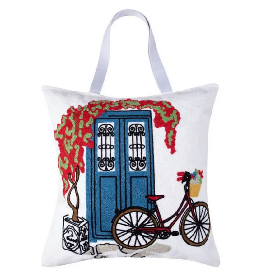 Ανακάλυψε μια μοναδική τσάντα με καλλιτεχνική διάθεση, διακοσμημένη με ένα ιδιαίτερο σχέδιο που αποπνέει μεσογειακή αισθητική και νησιώτικο χαρακτήρα. Η παράσταση με την παραδοσιακή πόρτα, το ποδήλατο και τα λουλούδια δημιουργεί μια ξεχωριστή εικόνα που θυμίζει καλοκαιρινές βόλτες στα σοκάκια των νησιών.